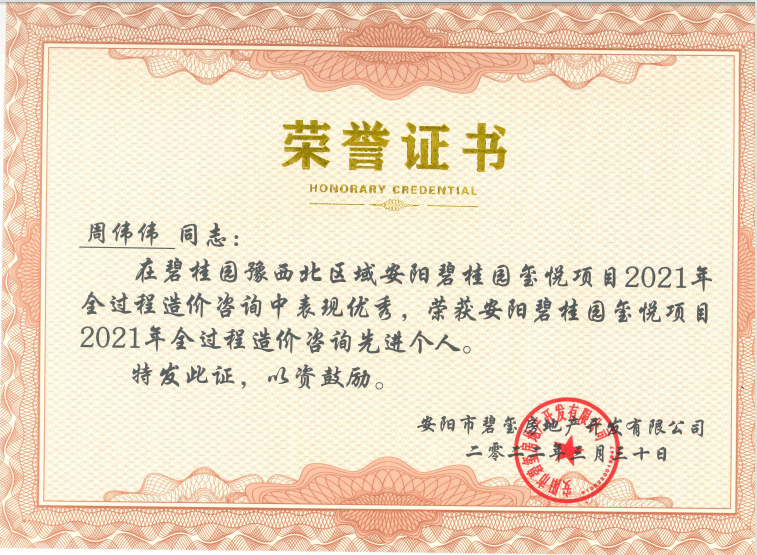 恭喜全國發(fā)展平臺第9項目分部安陽碧桂園項目土建組長周偉偉榮獲安陽市碧璽房地產(chǎn)開發(fā)有限公司頒發(fā)的“2021全過程造價咨詢先進個人”獎。