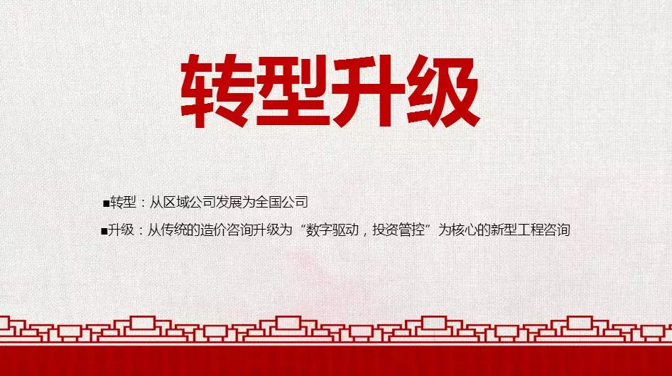 轉(zhuǎn)型是什么?我們把轉(zhuǎn)型定義成從一家區(qū)域型企業(yè)轉(zhuǎn)型為一家全國型企業(yè);升級是什么?是我們要從傳統(tǒng)的工程造價咨詢?yōu)橹鞯钠髽I(yè),升級為“數(shù)字驅(qū)動,投資管控”為核心的新型工程咨詢企業(yè)。