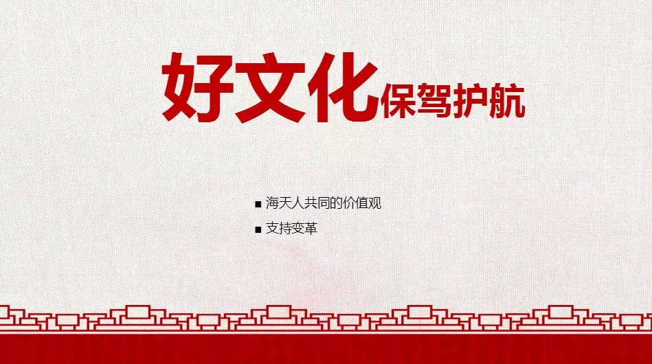 那什么是好文化呢?其實有兩點。第一點:共同的價值觀,第二點在變革時期需要一個好文化的支持,每當我們踏出一步,邁入新的領(lǐng)域,會焦慮。在變革的時代,不能走出去這是很危險的,所以我們的文化就是支持變革,包容創(chuàng)新,甚至要包容創(chuàng)新型的時代。