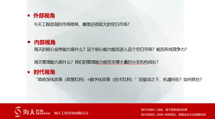 下面,我們來看行業(yè)背景:未來十年,新基建引領(lǐng)城市群的交通聯(lián)接、城市生態(tài)環(huán)境治理、以及圍繞數(shù)字化、5G和新能源汽車的投資規(guī)模將超過上個十年;在建筑業(yè),政府著力推進EPC、投建營、PPP等以總包商為主要的新模式,超級總包商將誕生;在工程咨詢業(yè),全咨推進和資質(zhì)取消逐步落地,各種突破模式將不斷涌現(xiàn),(除設(shè)計外)5年左右的時間將形成營收在10億量級的頭部企業(yè),那么,在如此背景下,海天咨詢作為有著500人規(guī)模的咨詢企業(yè),應(yīng)如何發(fā)力趁勢而為呢?