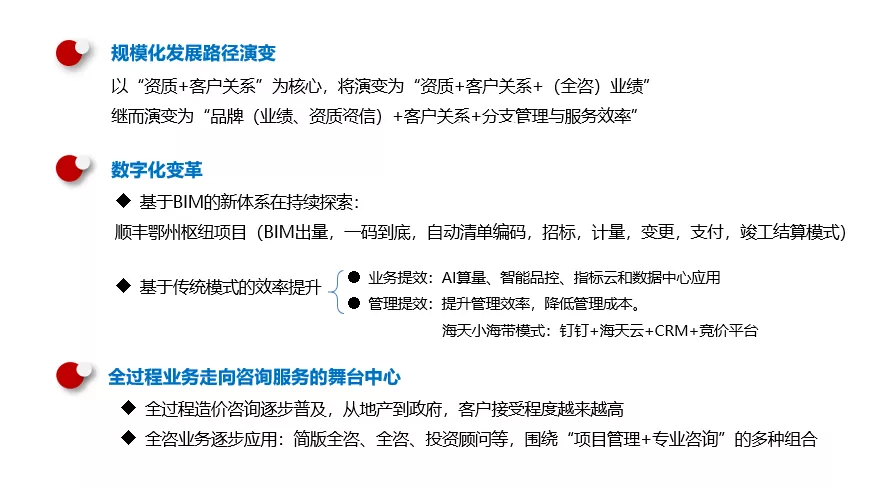 其實看過整個行業(yè)背景后,我們再轉(zhuǎn)過來看海天的發(fā)展路徑,就會發(fā)現(xiàn)隨著行業(yè)背景的改變,我們的發(fā)展路徑也在發(fā)生變化。第一、規(guī);l(fā)展路徑演變,在全咨推行后,以“資質(zhì)+客戶關(guān)系”為核心,將演變?yōu)?ldquo;資質(zhì)+客戶關(guān)系+(全咨)業(yè)績”,繼而演變?yōu)?ldquo;品牌(業(yè)績、資質(zhì)資信)+客戶關(guān)系+分支管理與服務(wù)效率”。