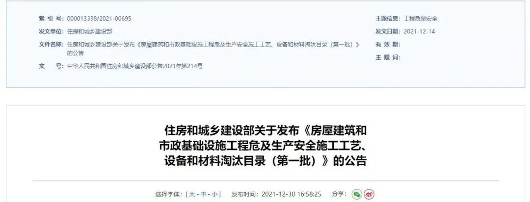 公告還提到,為了保障落實,負(fù)有安全生產(chǎn)監(jiān)督管理職責(zé)的各級住房和城鄉(xiāng)建設(shè)主管部門依據(jù)相關(guān)規(guī)定,開展對本《目錄》執(zhí)行情況的監(jiān)督檢查工作。