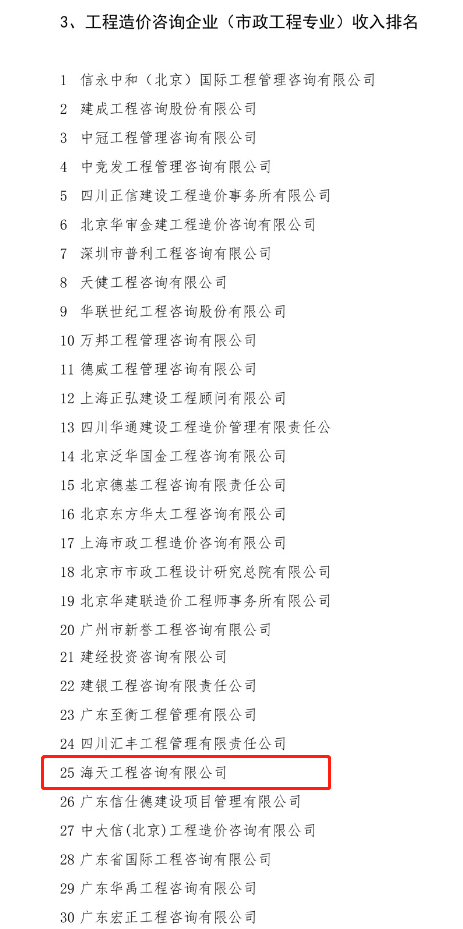 E-mail:haitianzixun@126.com日前,中國建設(shè)工程造價(jià)管理協(xié)會(huì)公布了2019年工程造價(jià)咨詢企業(yè)造價(jià)咨詢收入排名,海天咨詢2019年工程造價(jià)咨詢的總收入蟬聯(lián)河南省第一,其中市政工程專業(yè)收入排名方面,海天咨詢?cè)俣热脒x全國市政工程專業(yè)25強(qiáng),排名較去年上升5名。(關(guān)于海天咨詢2018年工程造價(jià)咨詢企業(yè)市政工程專業(yè)收入入圍全國30強(qiáng)!相關(guān)文章,點(diǎn)擊藍(lán)字既可閱讀)