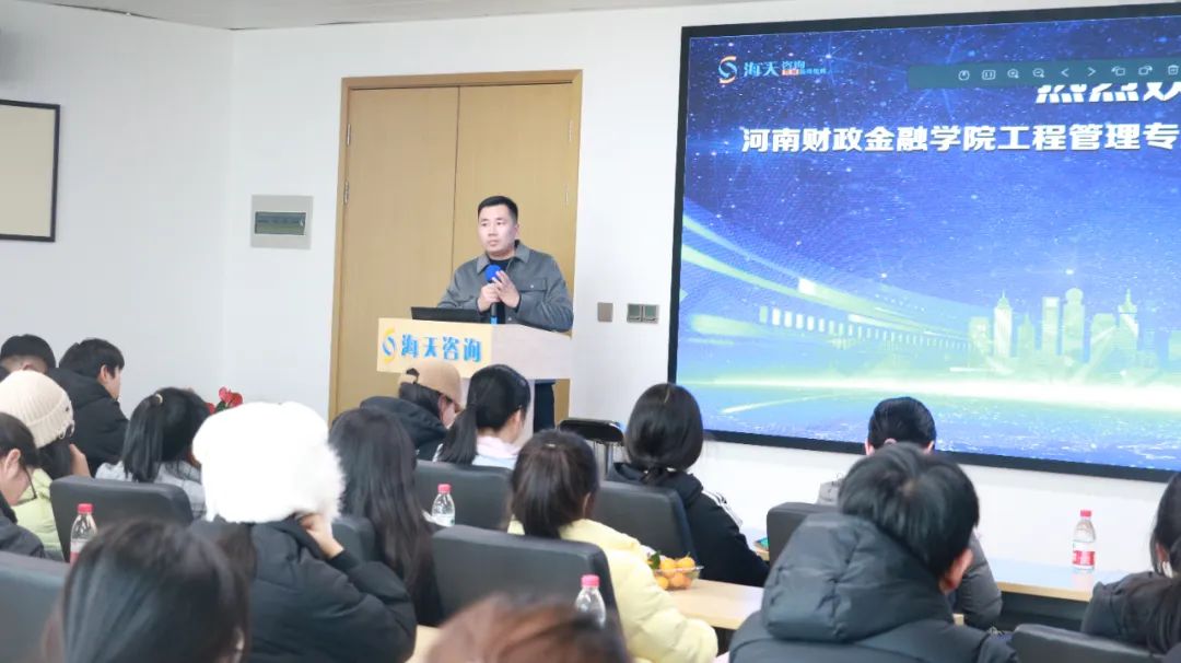 為幫助大學生提高社會實踐能力,擴展專業(yè)視野,12月26日下午,由王璐、李珂老師帶隊的河南財政金融學院工程管理專業(yè)2023級學生一行100余人,來到海天咨詢鄭州龍子湖全國總部進行參觀學習。海天咨詢人力資源總監(jiān)孫巍、總裁辦主任楊陽和第9分部總監(jiān)喬傳欽進行接待。