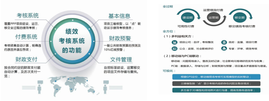 PPP項目績效考核系統(tǒng)以Web-BIM為基礎,結合GIS技術、大數據平臺及互聯網優(yōu)勢,旨在協(xié)助政府方對PPP項目開展績效考核工作。 系統(tǒng)包括項目信息、考核系統(tǒng)、財政支出監(jiān)測、問題統(tǒng)計分析與整改等多項模塊,可以為政府規(guī)范PPP項目績效考核工作、跟蹤項目問題整改情況、 建立項目資產臺賬和財政支出責任臺賬等,滿足政府績效管理多項工作需求。